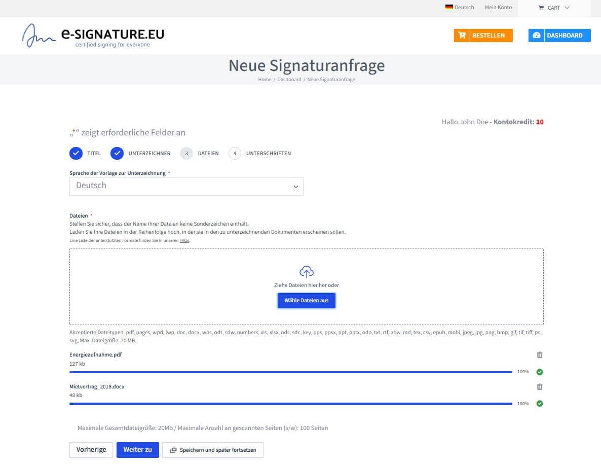 Jedes Mal, wenn Sie eine Person unterschreiben lassen, verbrauchen Sie einen Kredit, unabhängig von der Anzahl der Dokumente. Wenn Sie z.B. einen Vertrag und seine 3 Dokumente von 2 Unterzeichnern unterzeichnen lassen wollen, werden dafür 2 Kredite benötigt.